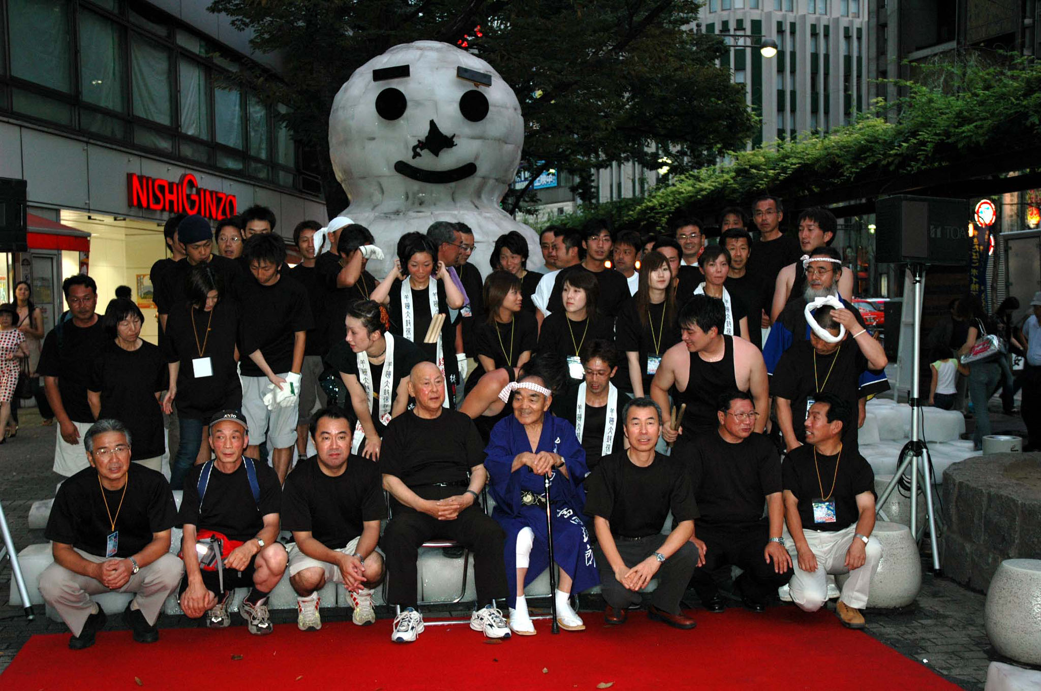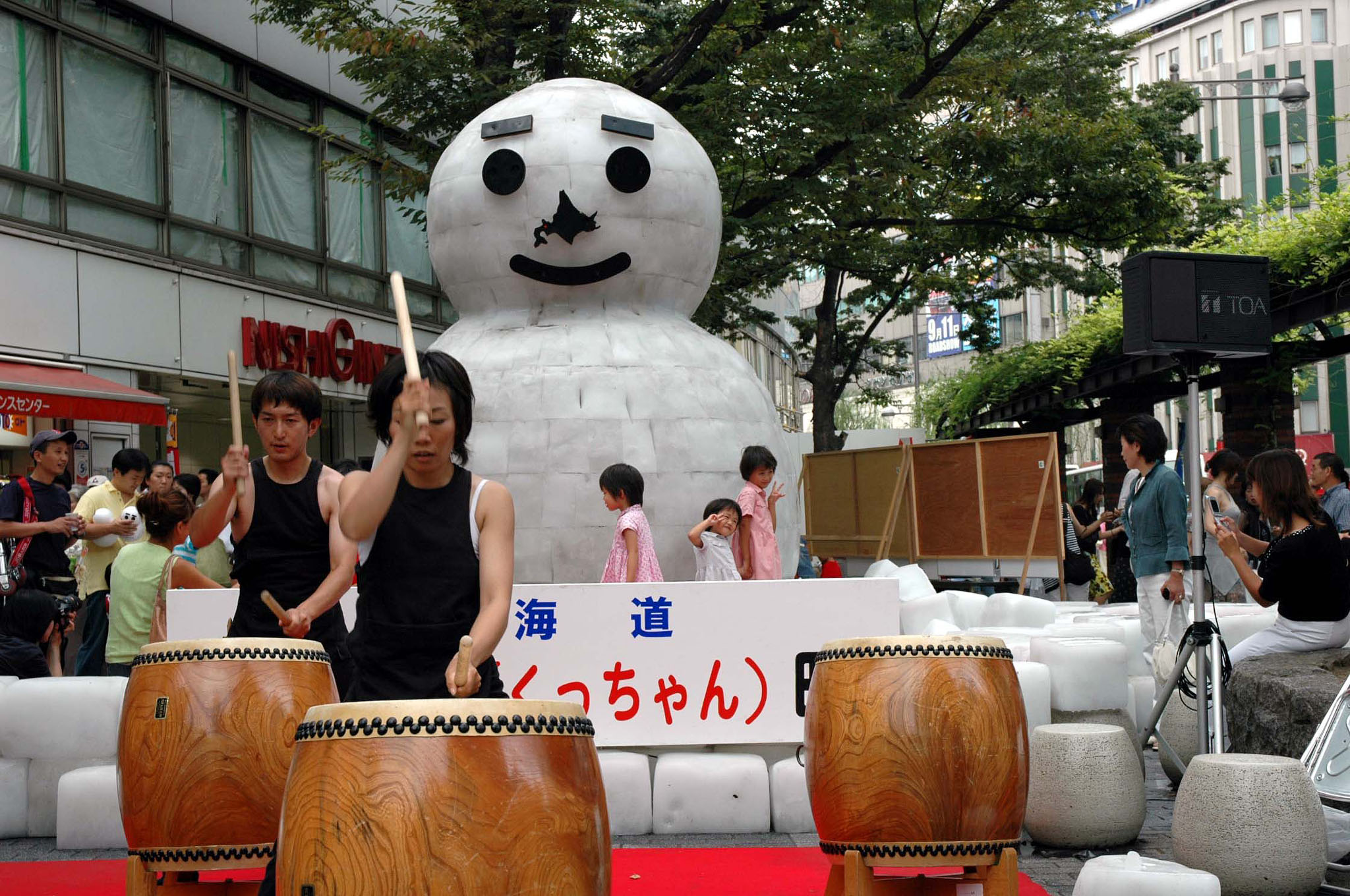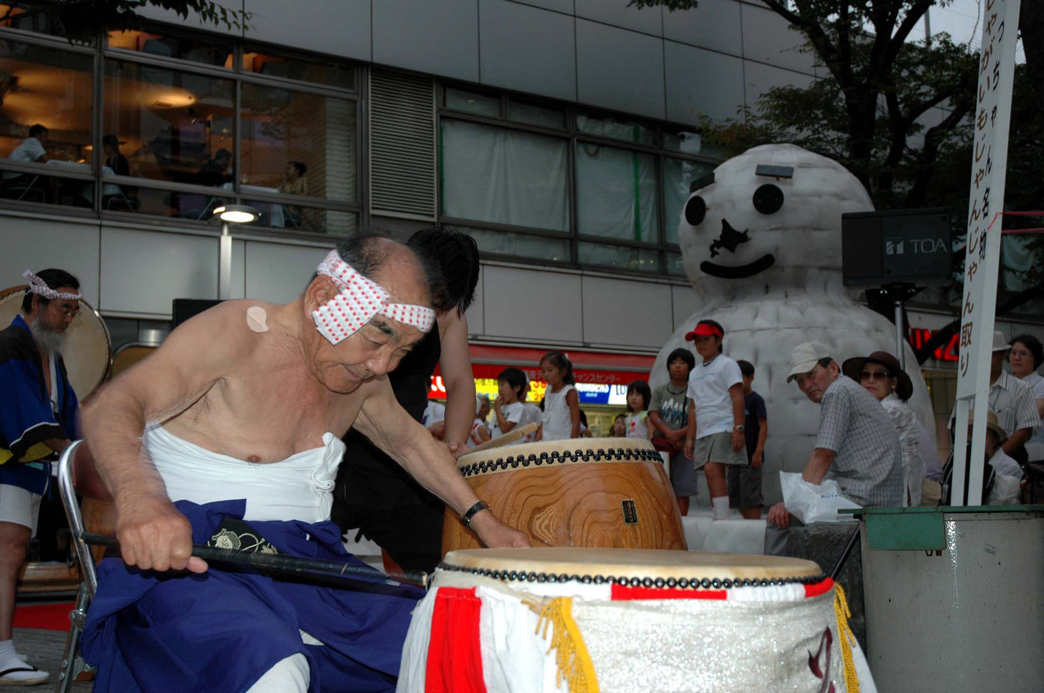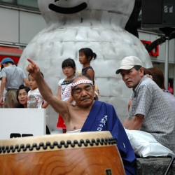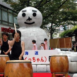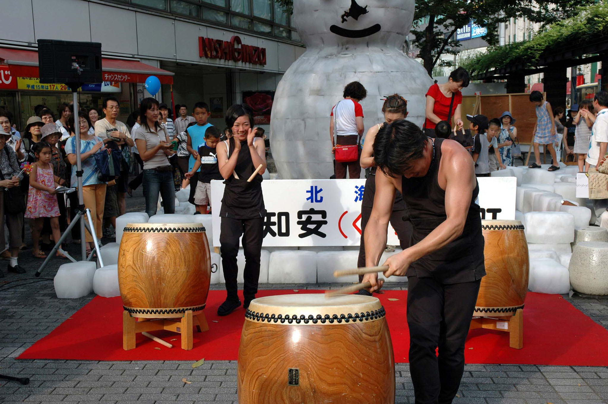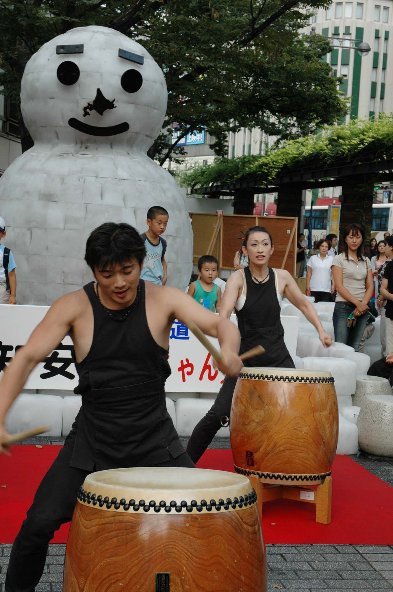 8月22日、東京銀座雪だるまのイベントに参加してきました。21日に現地(数寄屋橋公園)に到着、夕方から雪だるまの製作に入り、翌日イベントがおこなわれました。太鼓以外にもジャガイモのじゃんじゃんとりや、クイズ・スイカ割り等、とても楽しい内容でした。