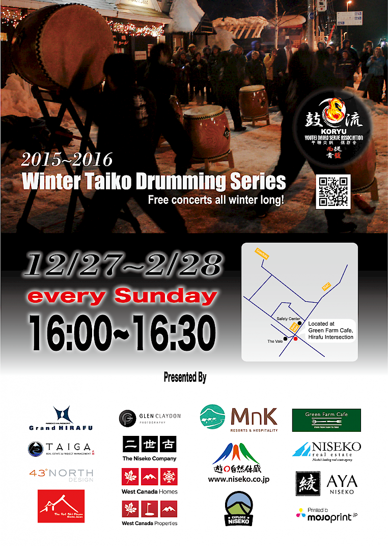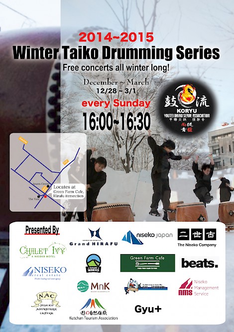 Starting on Sunday the 28th of December, Youtei Daiko Serve Association Koryu will be performing weekly between 4:00 and 4:30 PM in front of the Niseko Green Farm Cafe in Hirafu.